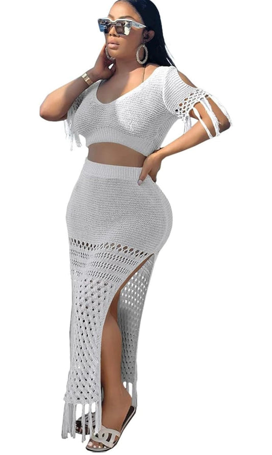 2 Piece Outfits for Women Sexy Crochet Tassel Split Midi Dress Summer