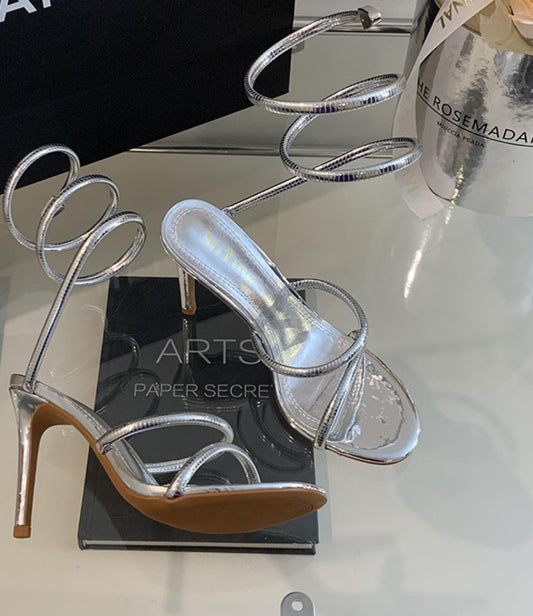 Women's Open Round Toe Leg Spiral Wrap Around Ankle Strap Stiletto Heel Sandal