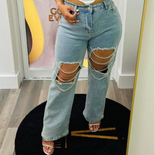 Womens Cut Out Holes Jeans Womens Chain Rhinestone Ripped Denim Pant Distressed Y2K Jean