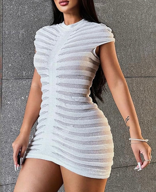Women's Sheer Stripe Mock Neck Cap Sleeve Club Knit Mini Bodycon Dress