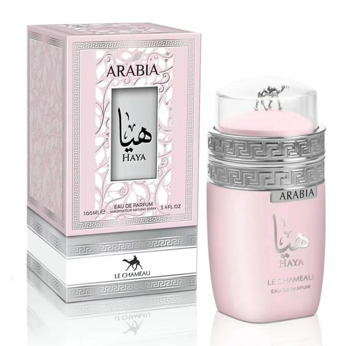 Product Description: Arabia Haya by Le Chameau is a fragrance inspired by the elegance and charm of the Middle East. This Eau de Parfum for women combines sophisticated notes that evoke a soft, feminine, and captivating essence. The bottle design reflects luxury and detail, decorated with metallic elements that resemble classic Arabic patterns and a decorative camel on the cap symbolizing Arabic heritage.