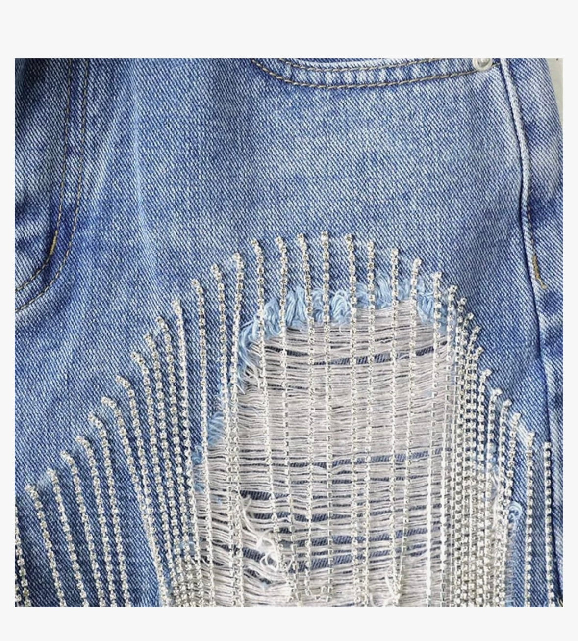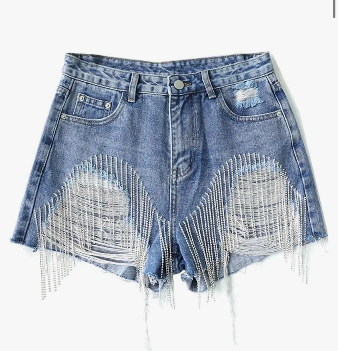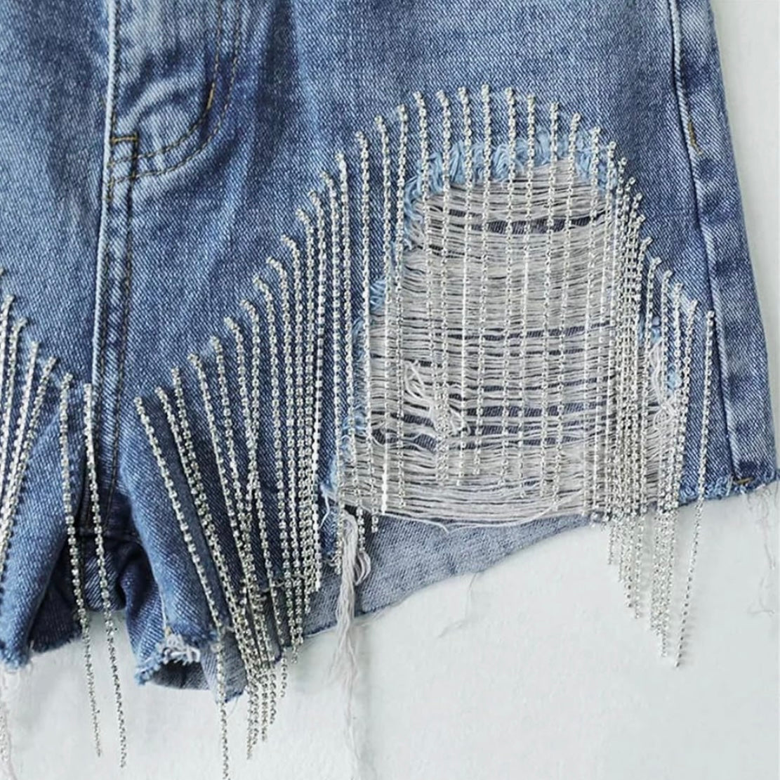 Women Summer Tassels Diamond Beads High Waist Denim Shorts