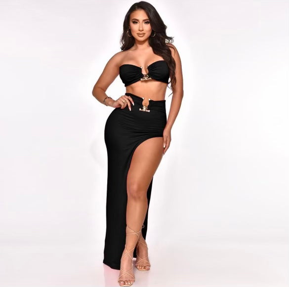 Feature: Womens 2 piece skirt sets , 2 piece dress , crop top, sleeveless, off the shoulder, side slit, high split , high waist, backless bra crop tops, bodycon maxi skirt set, beach swimsuits.
