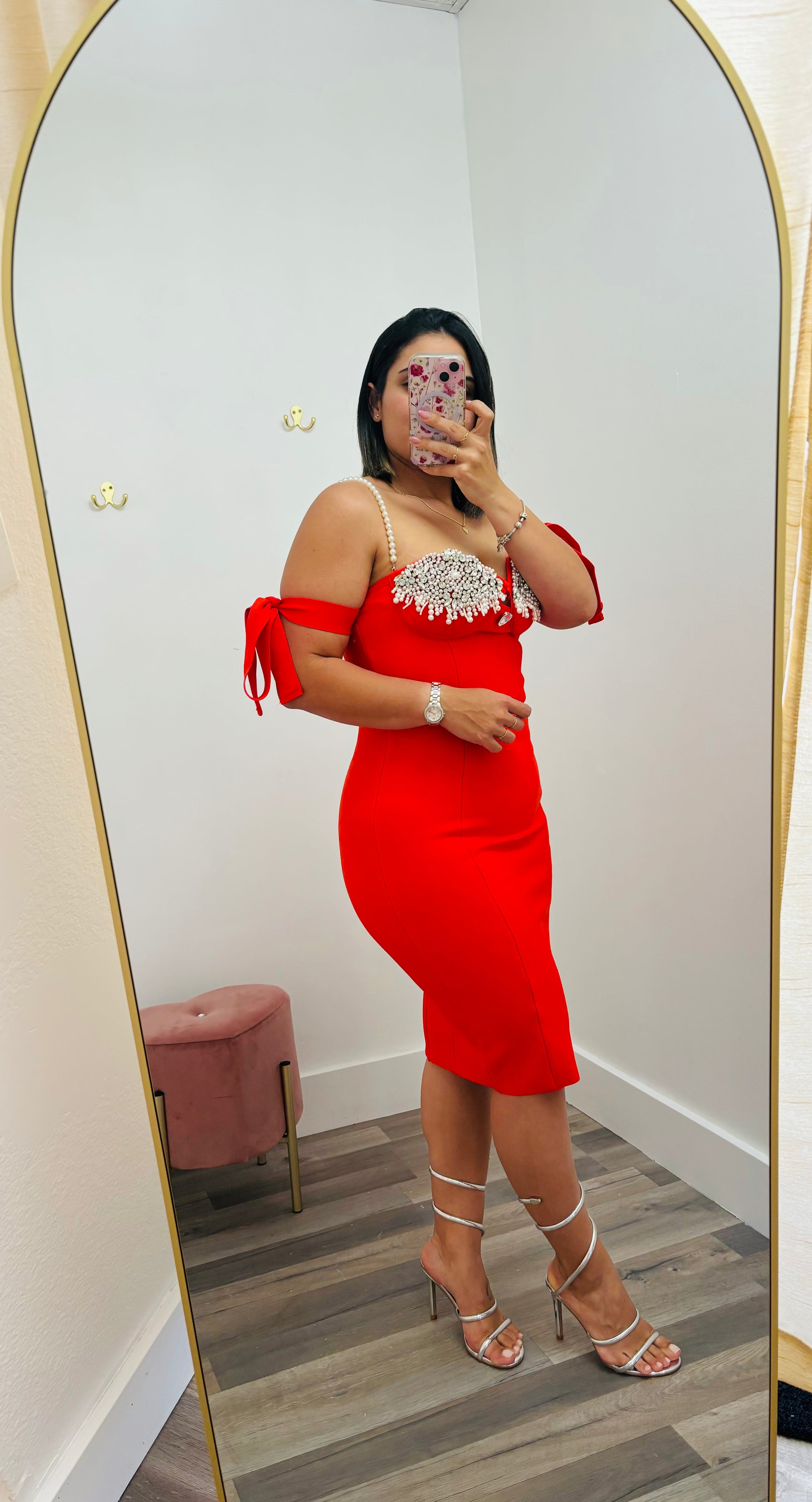 Step into the spotlight with this captivating cocktail dress, designed to turn heads at any event. Featuring intricate crystal embellishments and delicate shoulder ribbons, this dress perfectly balances elegance with a bold statement. The form-fitting silhouette enhances your natural curves, making it an ideal choice for a night out, a special occasion, or any event where you want to shine. Pair it with your favorite heels and accessories to complete the look.