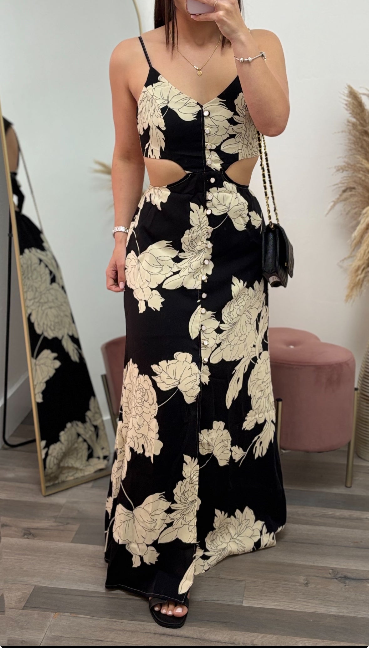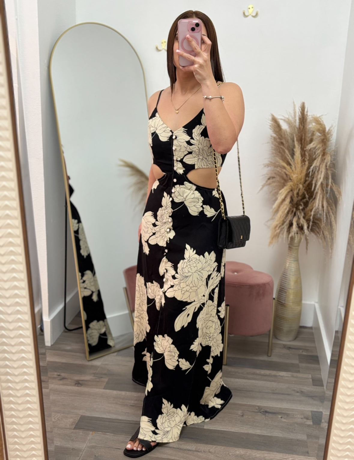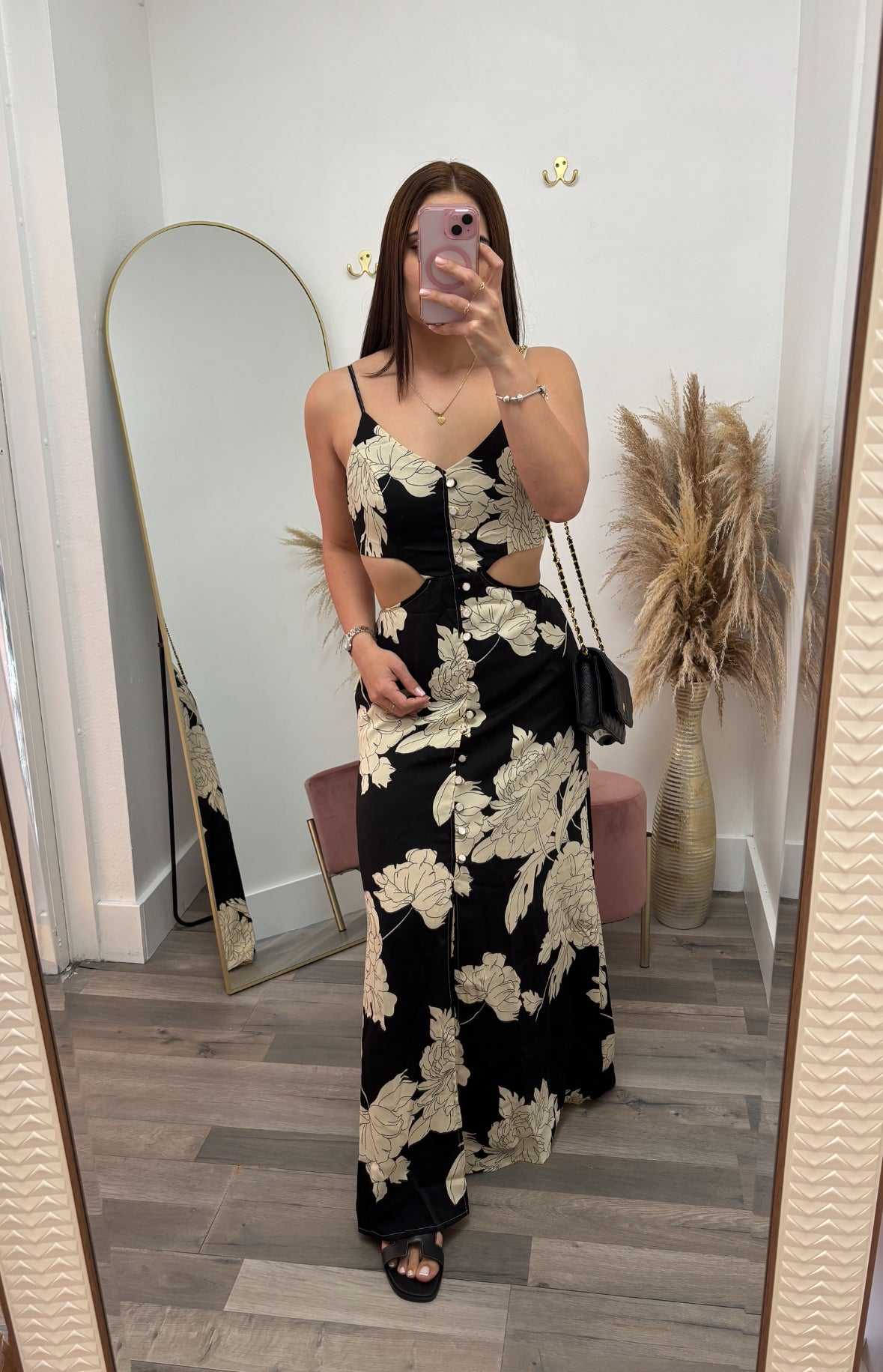 This stunning maxi dress features a deep black base with large, bold beige floral prints that add an elegant and tropical vibe. The dress has thin adjustable straps and a flattering V-neckline. Unique cutout details on both sides of the waist enhance your figure, while a row of decorative buttons runs down the front, giving the piece a refined and structured look. Perfect for summer outings, beach dinners, or vacation nights out, this dress combines sophistication with a touch of playfulness.