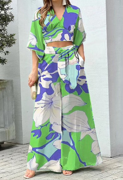 Embrace effortless elegance with this floral print wrap top and wide-leg pants set, perfect for making a statement this season. The set features a chic wrap-style crop top with flutter sleeves, providing a relaxed yet stylish look. The matching wide-leg pants are designed with a high waist and a flowy silhouette, offering both comfort and a flattering fit. The vibrant floral pattern adds a pop of color and a touch of sophistication to your wardrobe, making this set ideal for summer outings, vacations, or any special occasion where you want to stand out. Pair it with sandals or heels to complete the look.