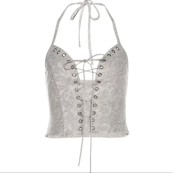 Add a touch of edgy elegance to your wardrobe with this halter lace-up corset top. Designed with a flattering halter neckline, this top features intricate lace-up details along the front, offering a customizable fit and a stylish, modern look. The structured corset style enhances your figure, making it an ideal choice for pairing with high-waisted jeans, skirts, or tailored pants for a chic, contemporary outfit. Perfect for a night out, festival, or any occasion where you want to make a statement, this top combines classic design with a bold twist.