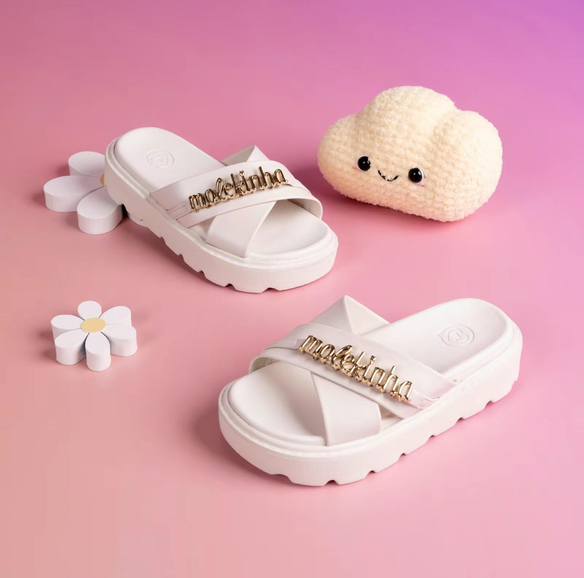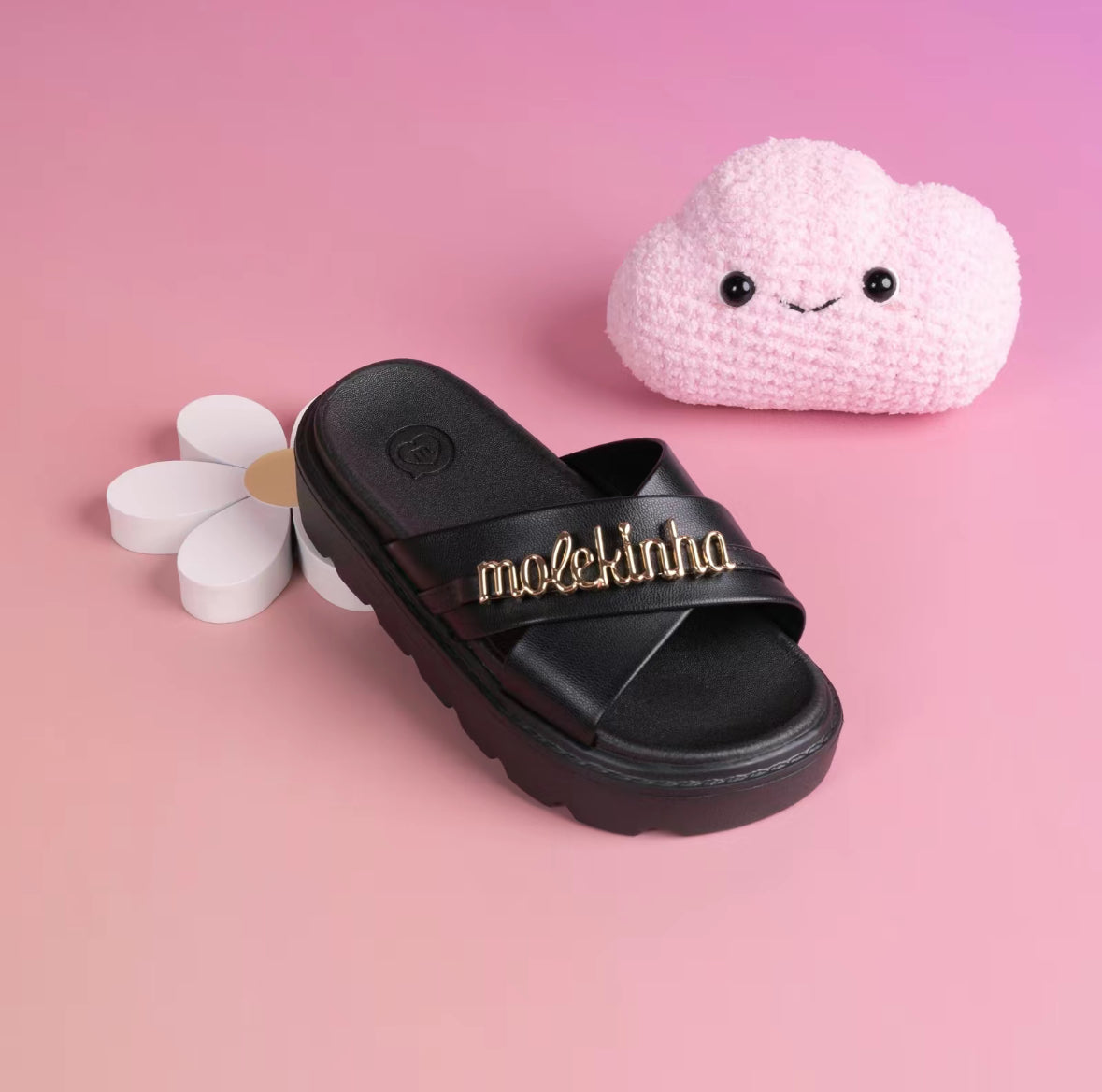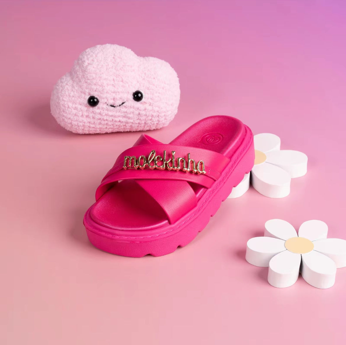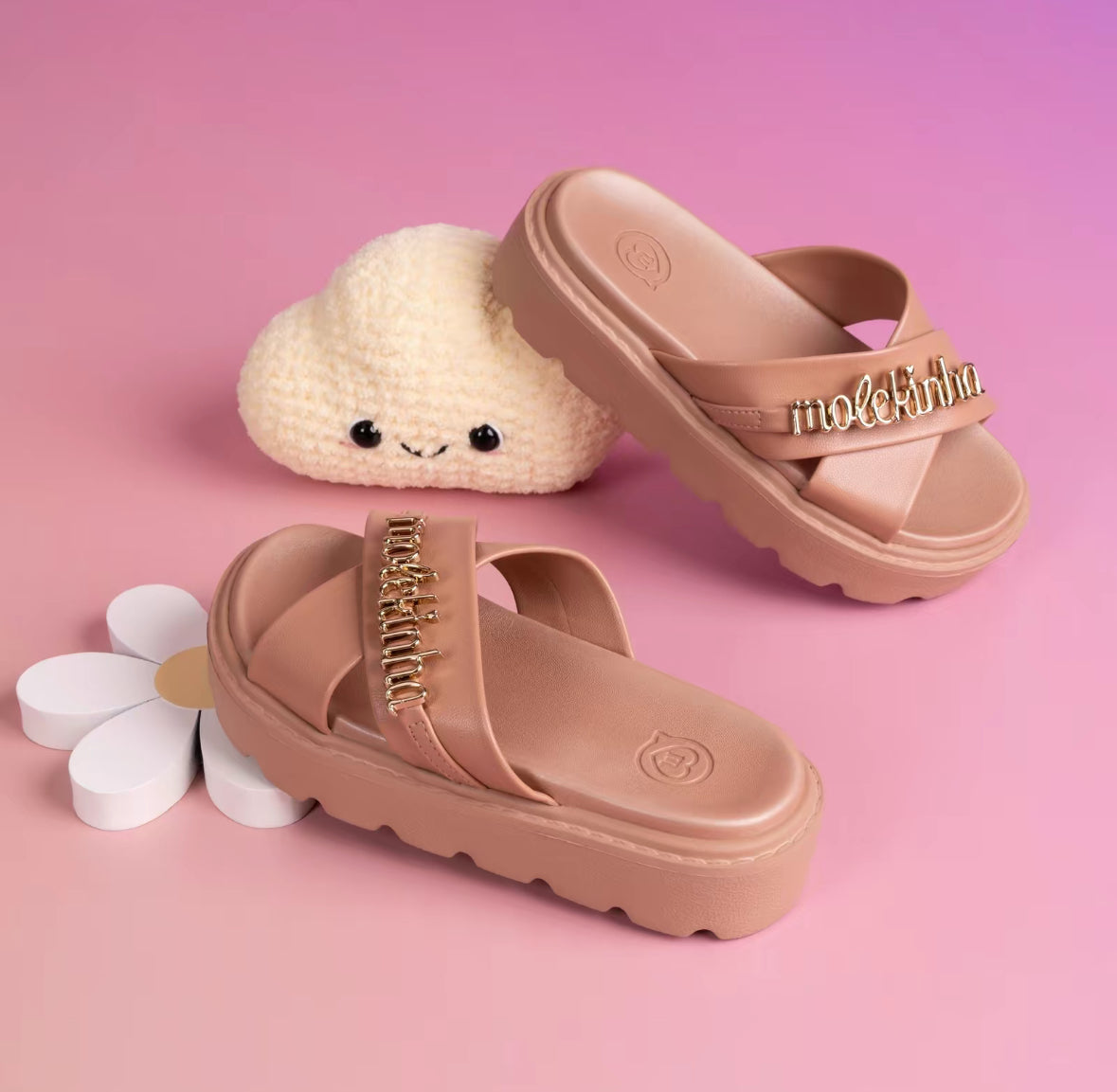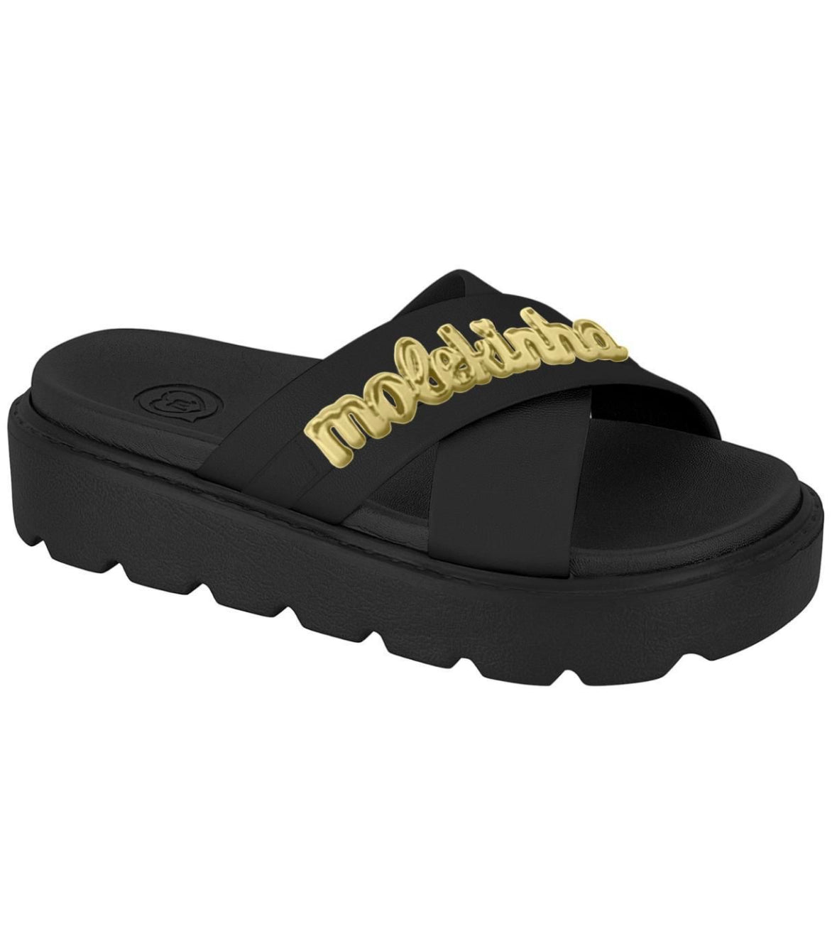 These stylish kids' sandals combine comfort and fashion effortlessly. Designed with a durable platform sole for added height and stability, they feature cross straps adorned with a chic gold-tone "Molekinha" detail for a trendy touch. Perfect for everyday wear or special occasions, these sandals provide a comfortable fit and a playful design that young girls will love. Ideal for pairing with summer outfits, these sandals are a must-have addition to your child's wardrobe.