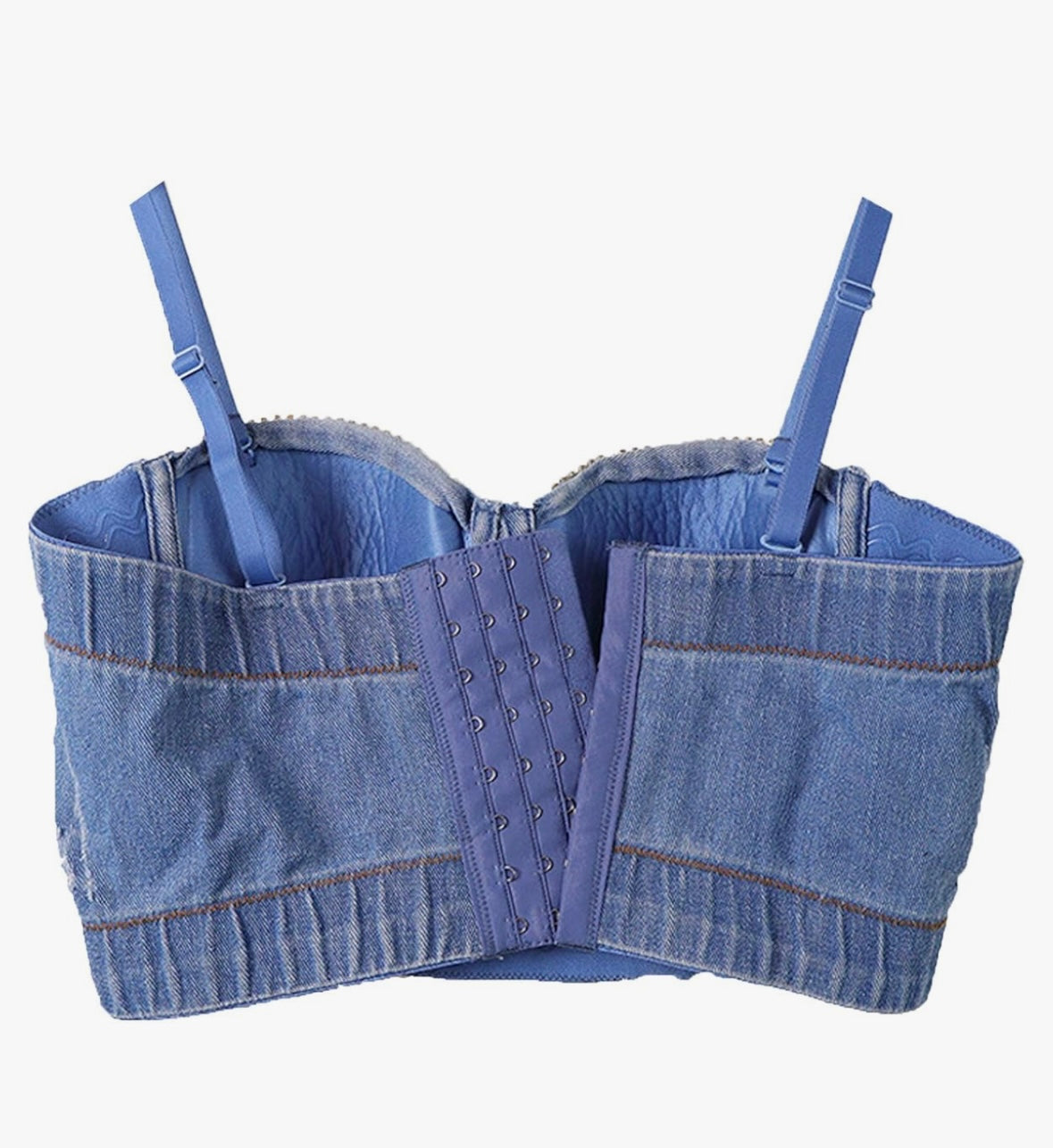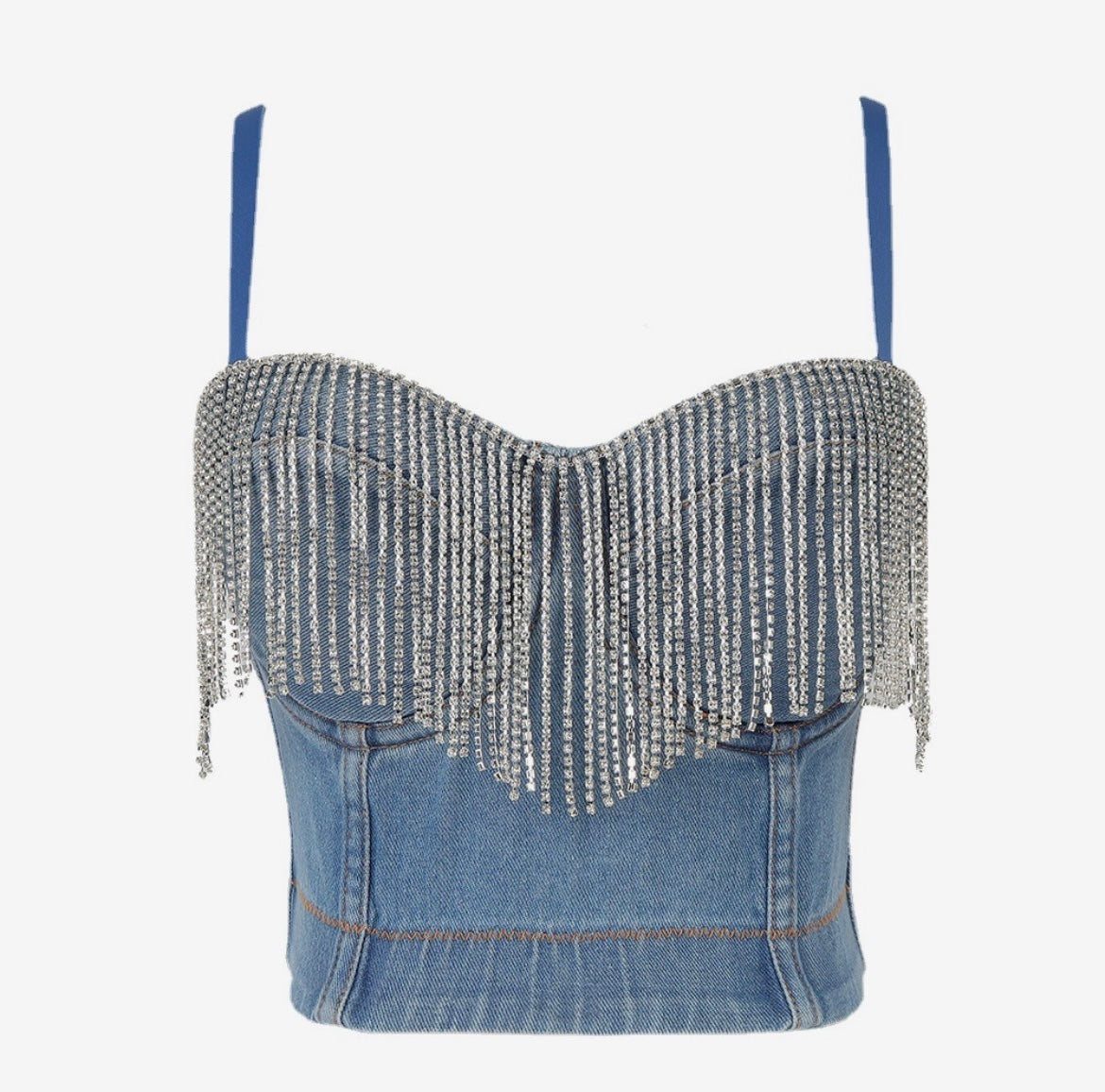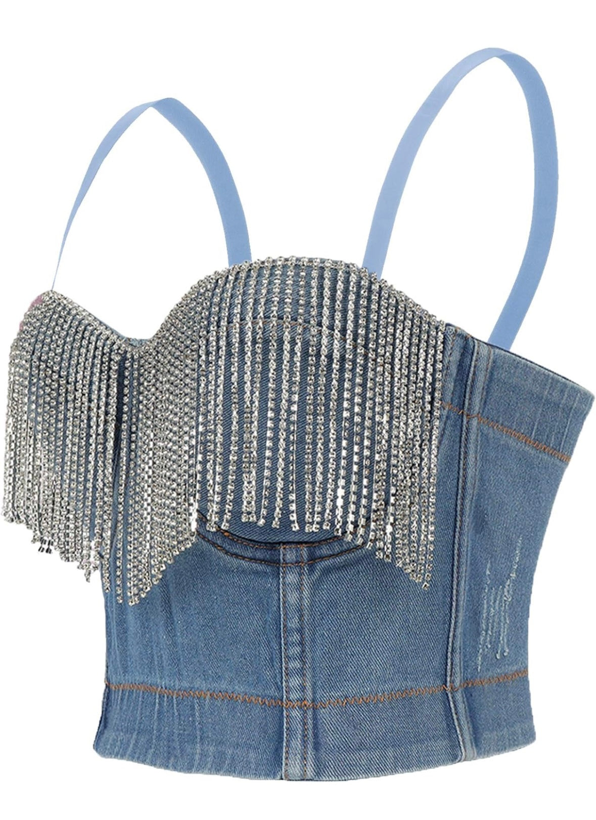 Make a bold fashion statement with this dazzling rhinestone fringe denim corset top, blending edgy style with glamorous details. The top features a structured denim bodice that ensures a flattering fit and comfortable support. Its standout feature is the cascading rhinestone fringe detailing, which adds a touch of luxury and dynamic movement, perfect for drawing attention and adding sparkle to your look. The delicate spaghetti straps balance the bold design, making this top ideal for nights out, special occasions, or anytime you want to elevate your outfit. Pair it with high-waisted jeans or a skirt for a chic and unforgettable ensemble.