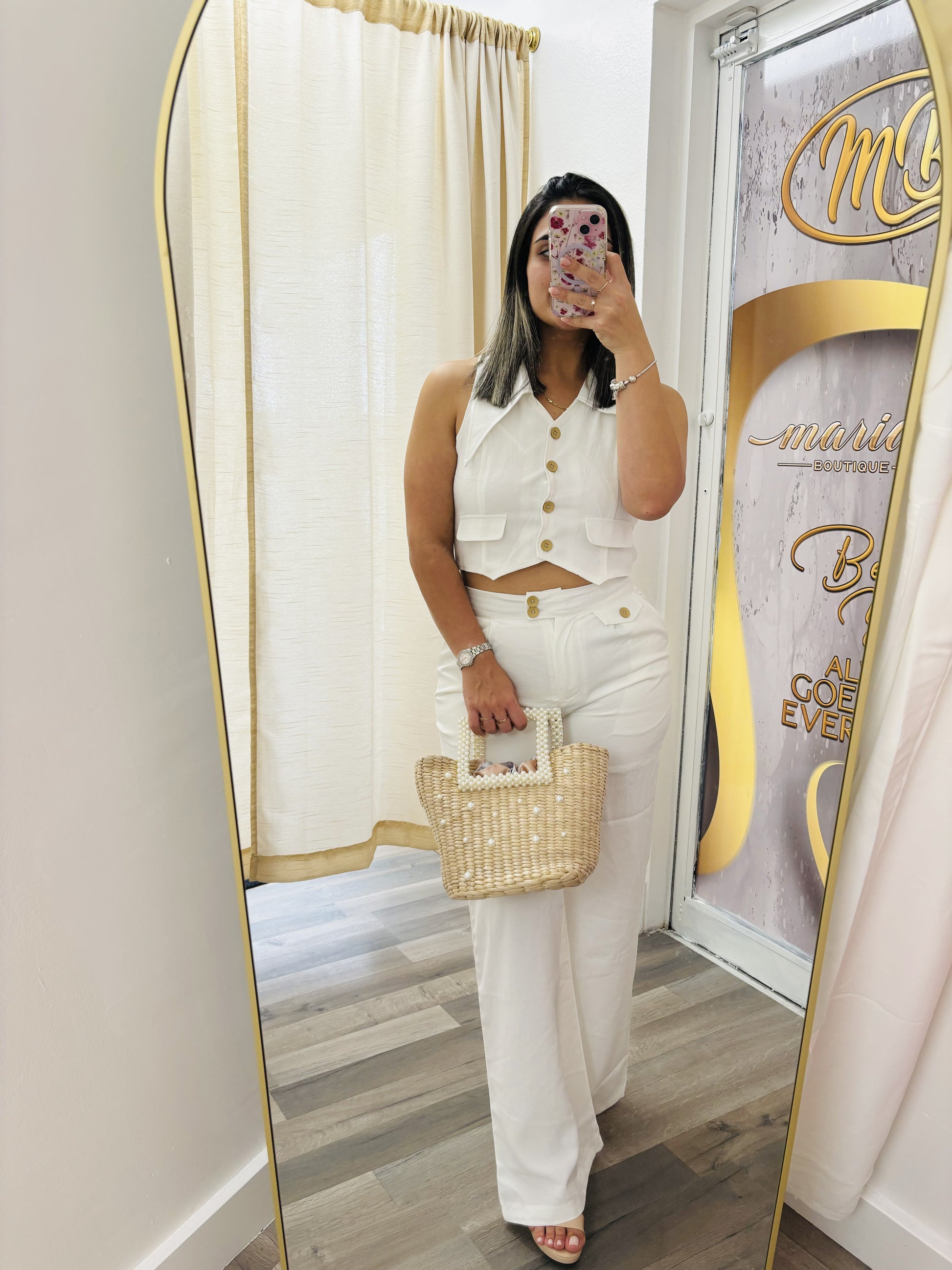 Elevate your warm-weather wardrobe with this elegant sleeveless button-down crop top and wide-leg pants set, perfect for a chic and polished look. The crop top features a classic collared design with front button closures, offering a tailored fit that adds sophistication to the ensemble. Paired with high-waisted wide-leg pants, this set creates a graceful and elongated silhouette that flatters any figure. The pants are designed with a relaxed fit, ensuring comfort while maintaining a sleek and stylish appearance. Ideal for both casual outings and more formal occasions, this set can be easily dressed up with heels or kept casual with sandals. The set is presented in a crisp, clean white color, making it a versatile addition to your wardrobe for any season.