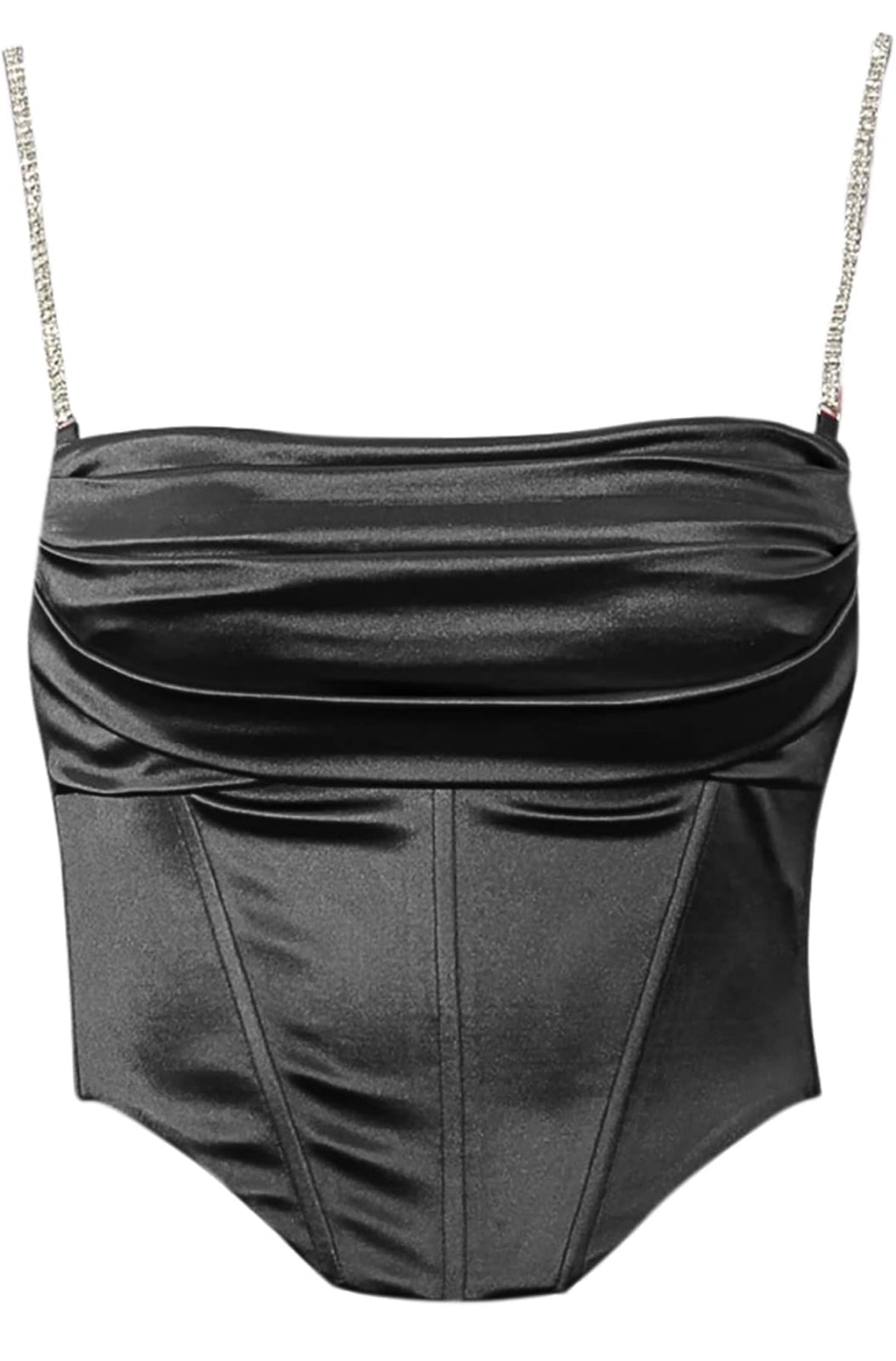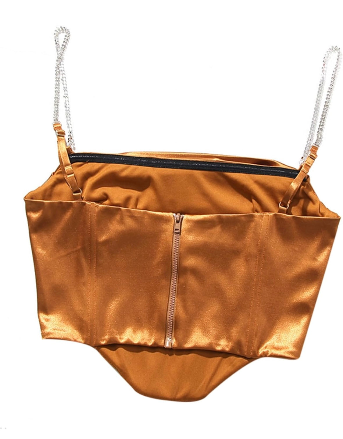 Feature: The Glitter rhinestone shoulder strap can be removable.The side of the silk tank top has zipper closure, easy to wear. This outfit has the effect of narrowing the waist and girdling the chest, which can better show your figure curve.