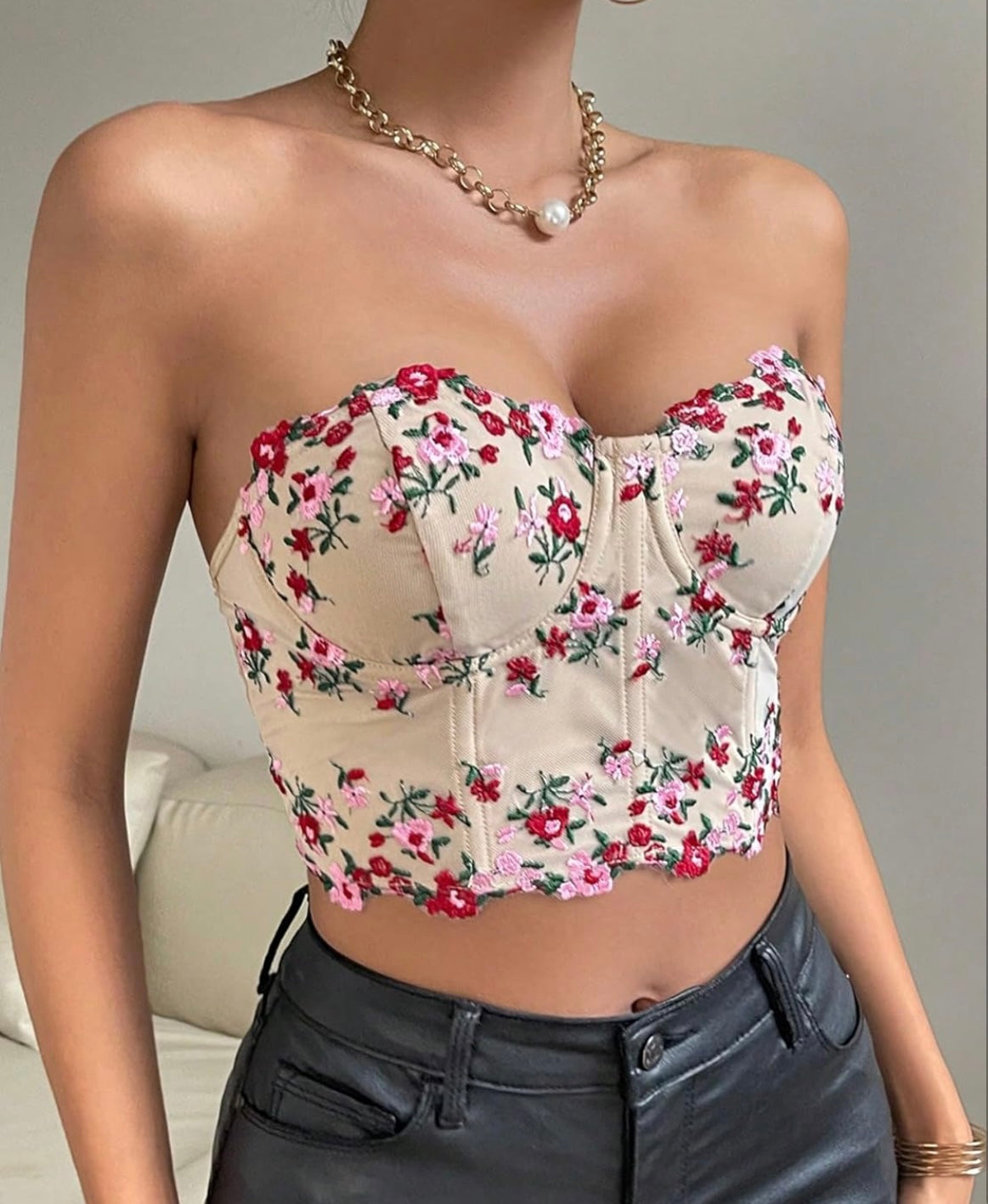 Features: floral embroidery, strapless, backless, slim fit, crop tube top